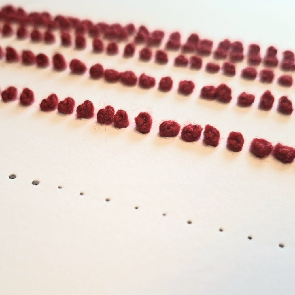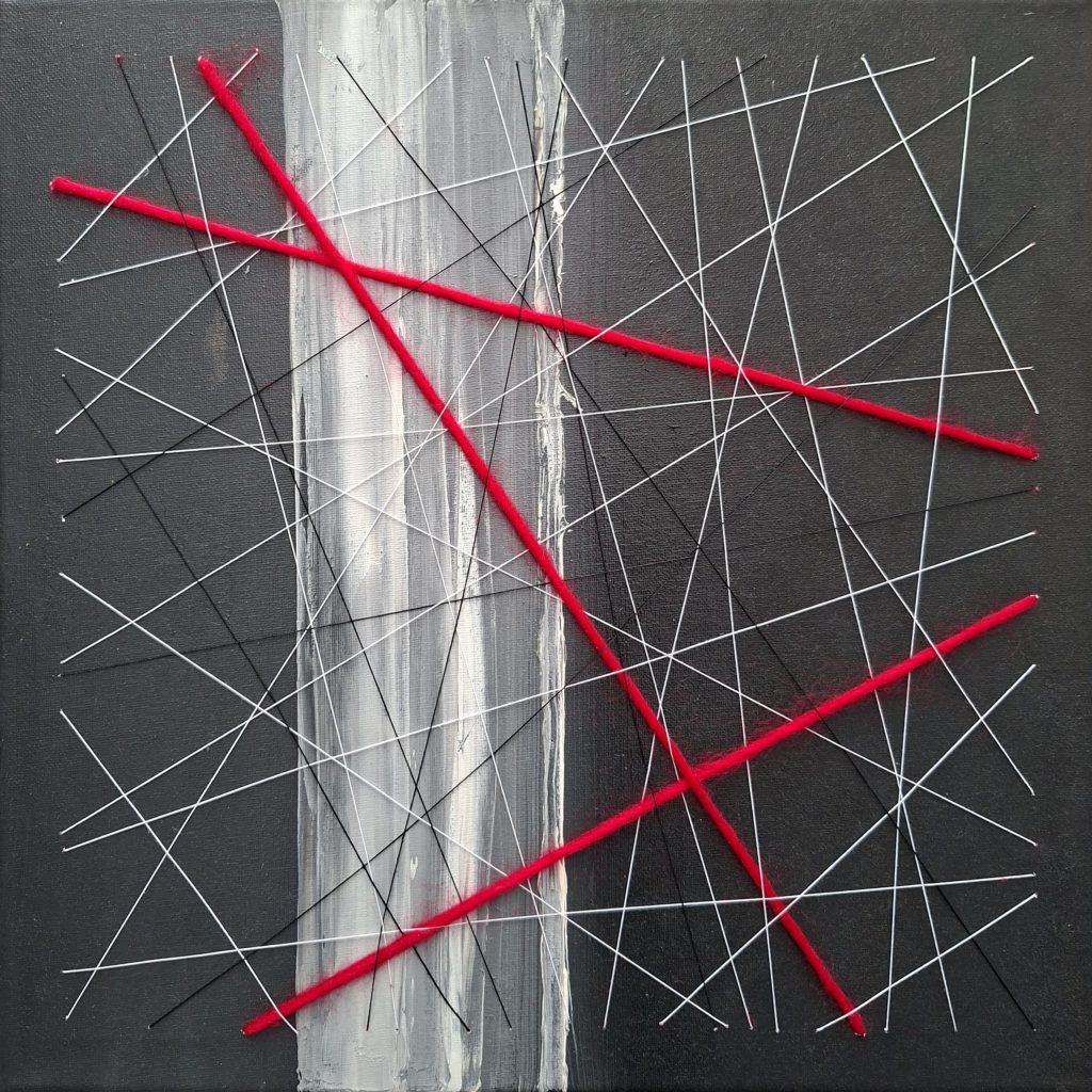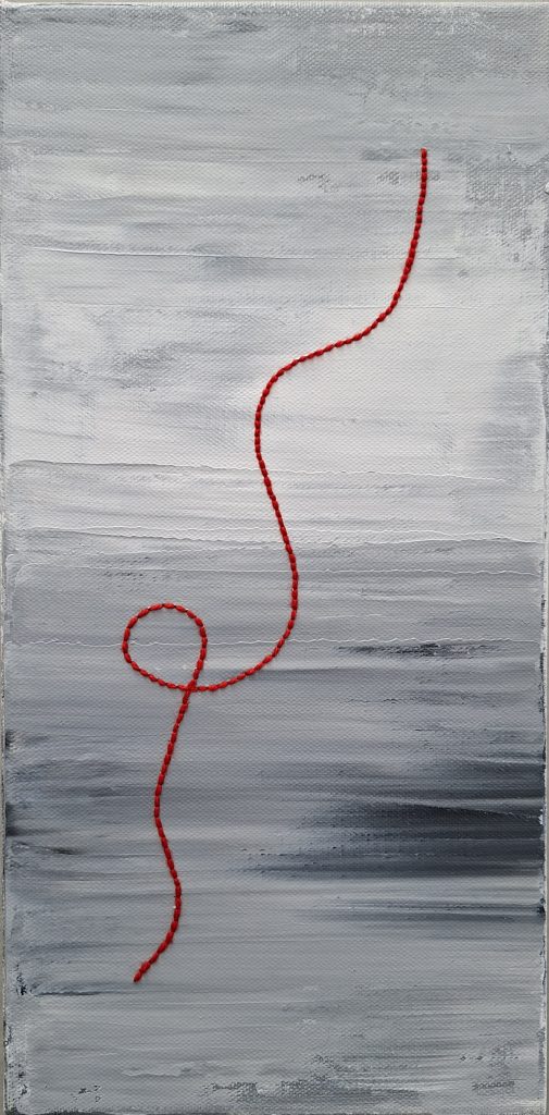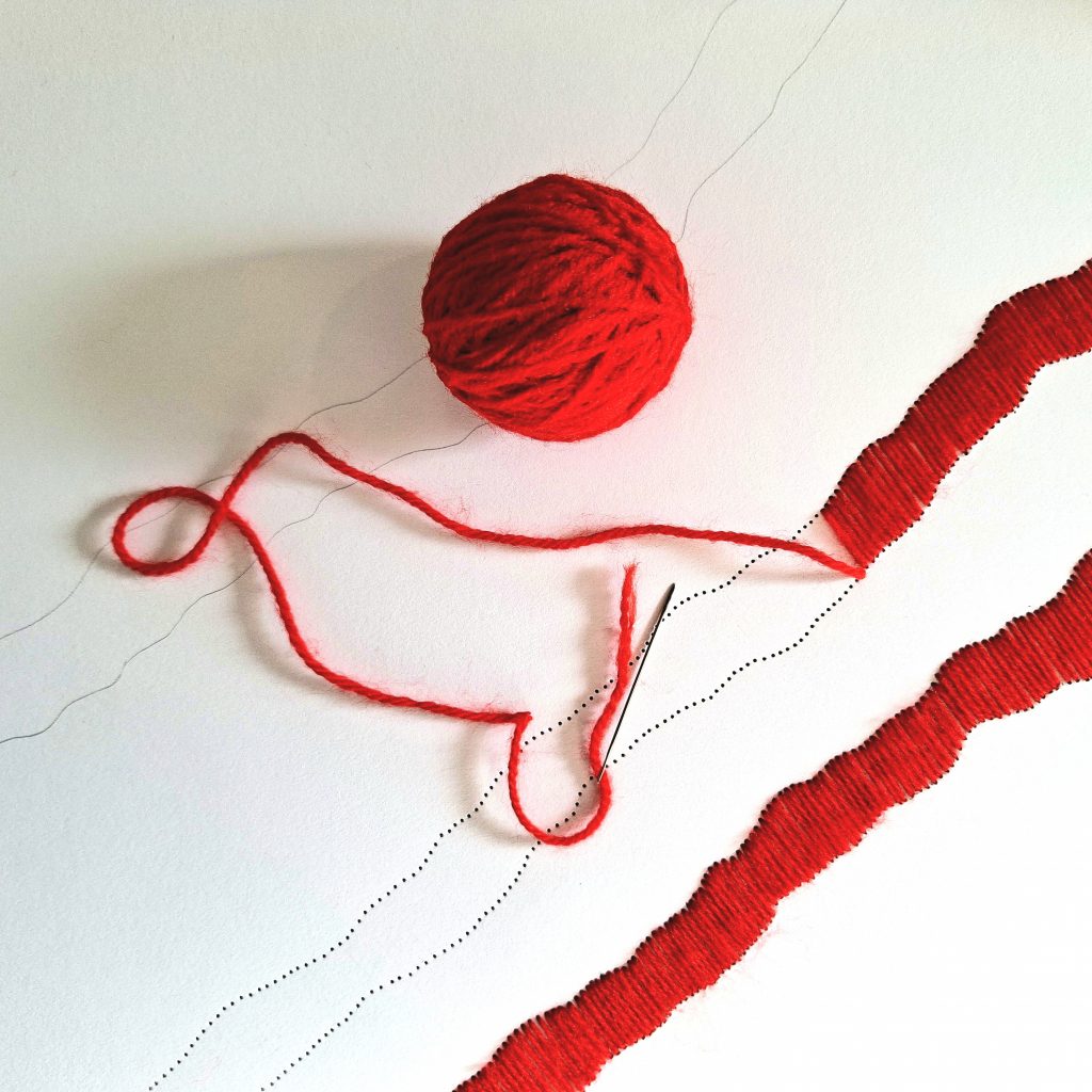 La couture vient traverser le papier, la toile ou le tissu comme une ligne de pensée, fragile mais déterminée. Le support devient territoire d’expérimentation. Le fil y laisse une trace, une cicatrice, une ligne, une écriture. Chaque point de couture affirme un rythme, chaque passage de laine construit un relief. La matière déborde du plan, dialogue avec le support, crée des ombres et des tensions. Le surface devient un véritable support artistique, traversé, perforé et transformé par le geste.