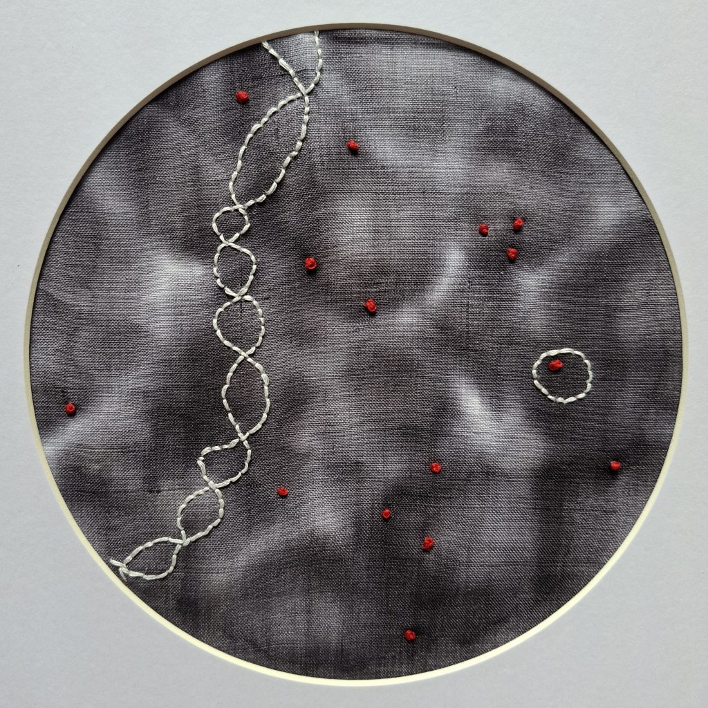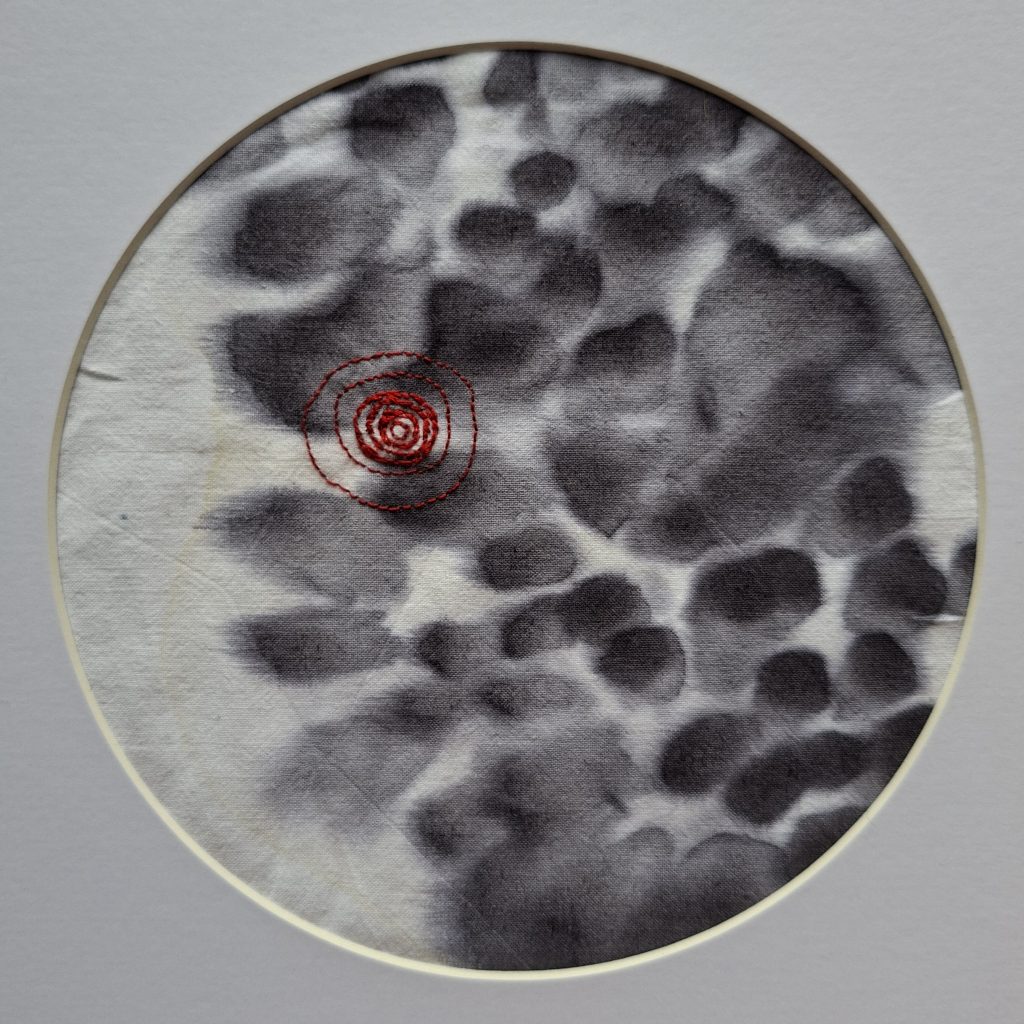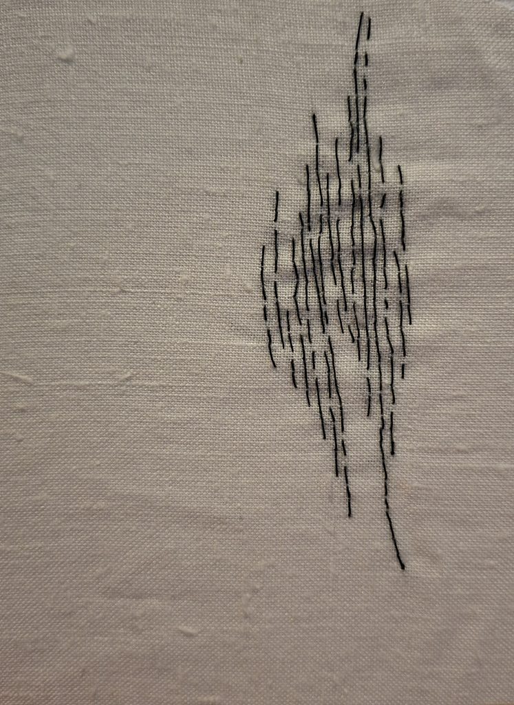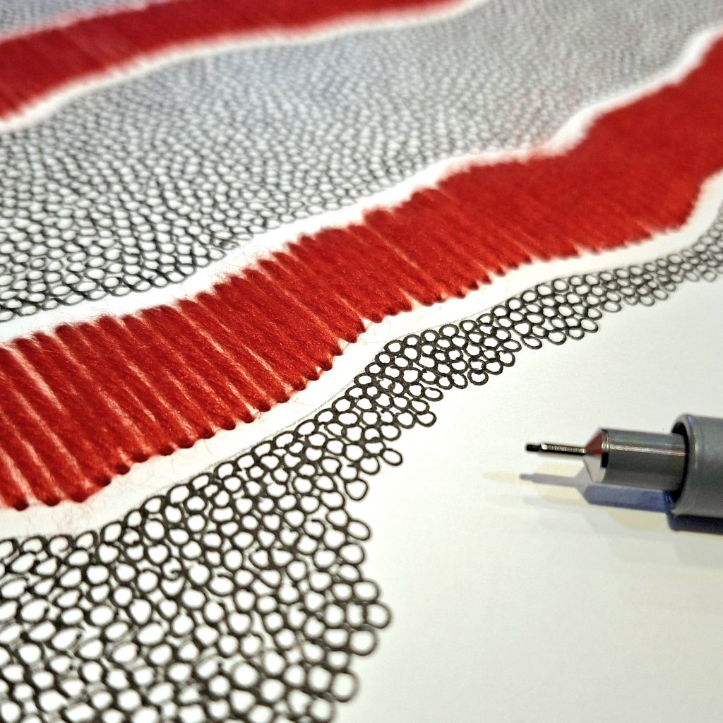 La couture vient traverser le papier, la toile ou le tissu comme une ligne de pensée, fragile mais déterminée. Le support devient territoire d’expérimentation. Le fil y laisse une trace, une cicatrice, une ligne, une écriture. Chaque point de couture affirme un rythme, chaque passage de laine construit un relief. La matière déborde du plan, dialogue avec le support, crée des ombres et des tensions. Le surface devient un véritable support artistique, traversé, perforé et transformé par le geste.