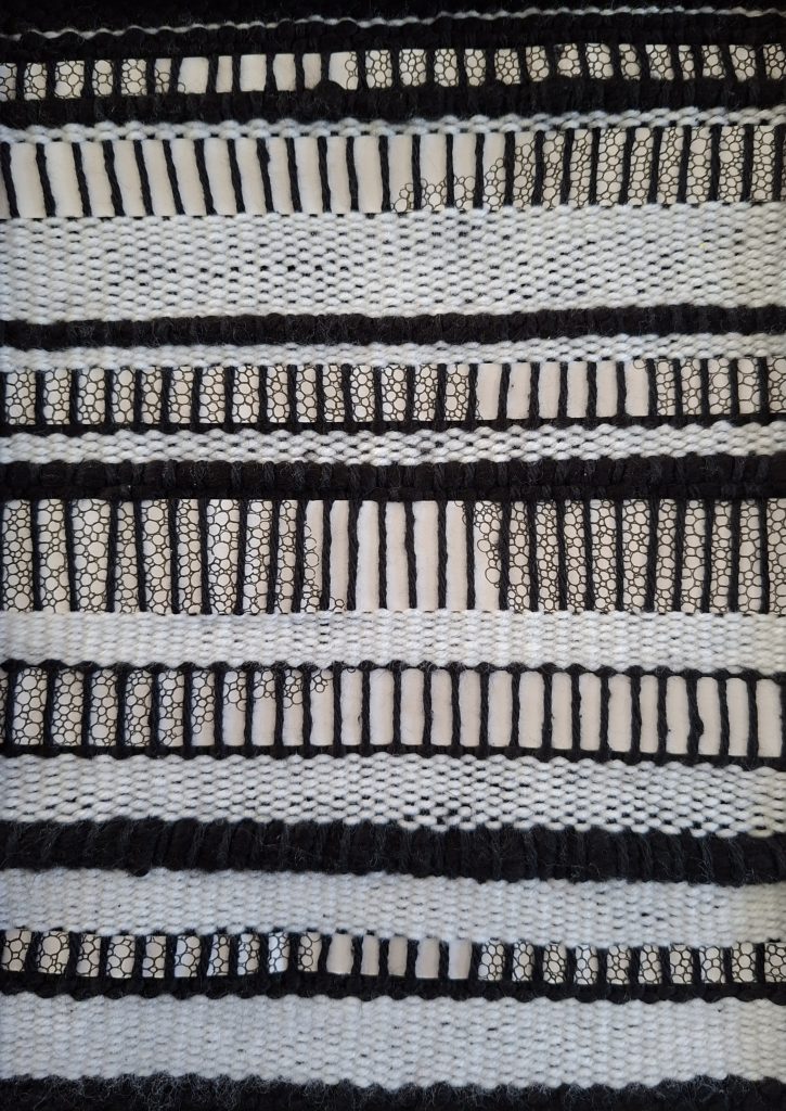 Réalisée à la main, ces pièces associent fibres, jeux de textures et compositions abstraites. Le tissage en laine et la broderie apportent volume et profondeur, tandis que le travail du fil structure la composition à travers une couture précise et expressive, créant un effet visuel moderne et minimaliste.